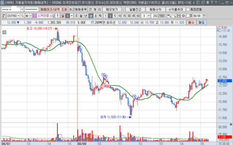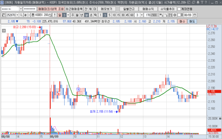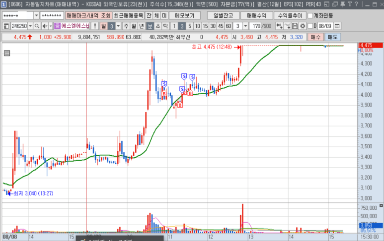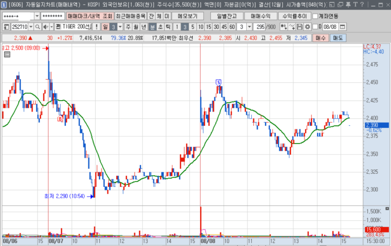 HTS가 찍어준 거래내역 "일지차트 ( B 매수, S 매도 표시임)