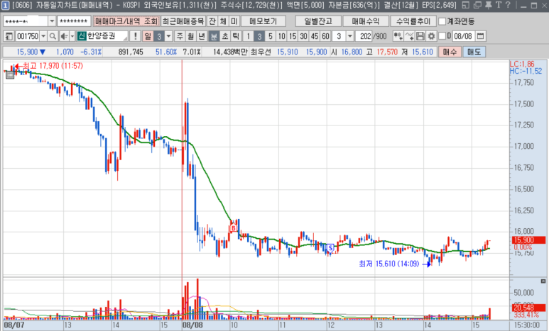 다른 종목들은 손실이 크지 않은데 한양증권은 손실이 큽니다