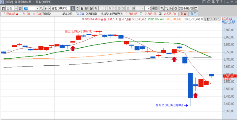 오늘의 코스피지수 일봉차트(8월 9일 금요일)