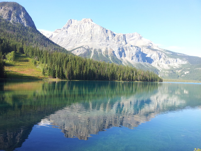 에메랄드 빛 호수에 비치는 산이 너무나 아름답다.