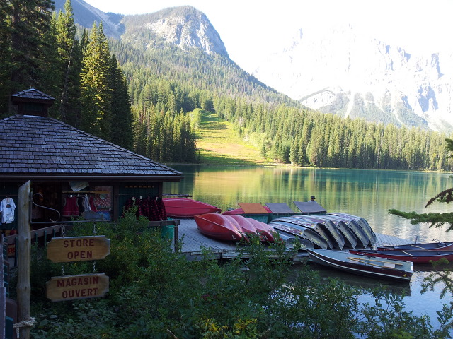 에메랄드 호수 왼쪽에는 기념품가게가 있고 그곳에서 카누를 빌려주고 있다.