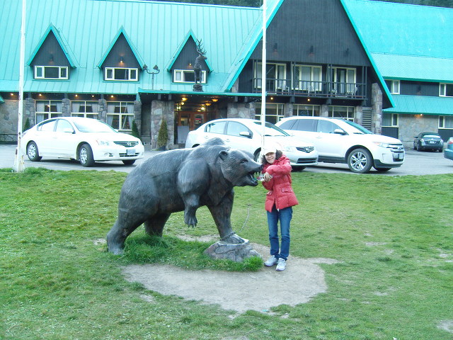 아내가 글레이셔 파크 로지 앞에 서 있는 곰 동상의 입에 손을 넣고 포즈를 잡는다.