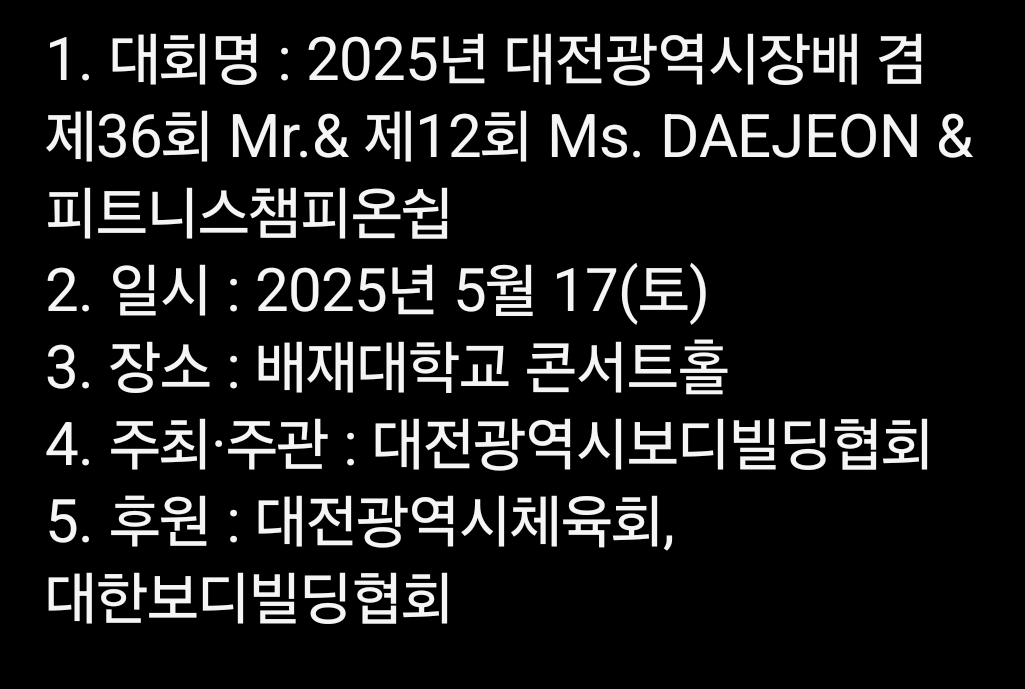 제36회 미스터 대전 선발대회 작성자최영호(심판위원장)|작성시간25.02.26|조회수38 목록 댓글 0 글자크기 작게가 글자크기 크게가 다음검색 현재 게시글 추가 기능 열기 북마크 공유하기 신고 센터로 신고 댓글 댓글 0 댓글쓰기 답글쓰기 댓글 리스트