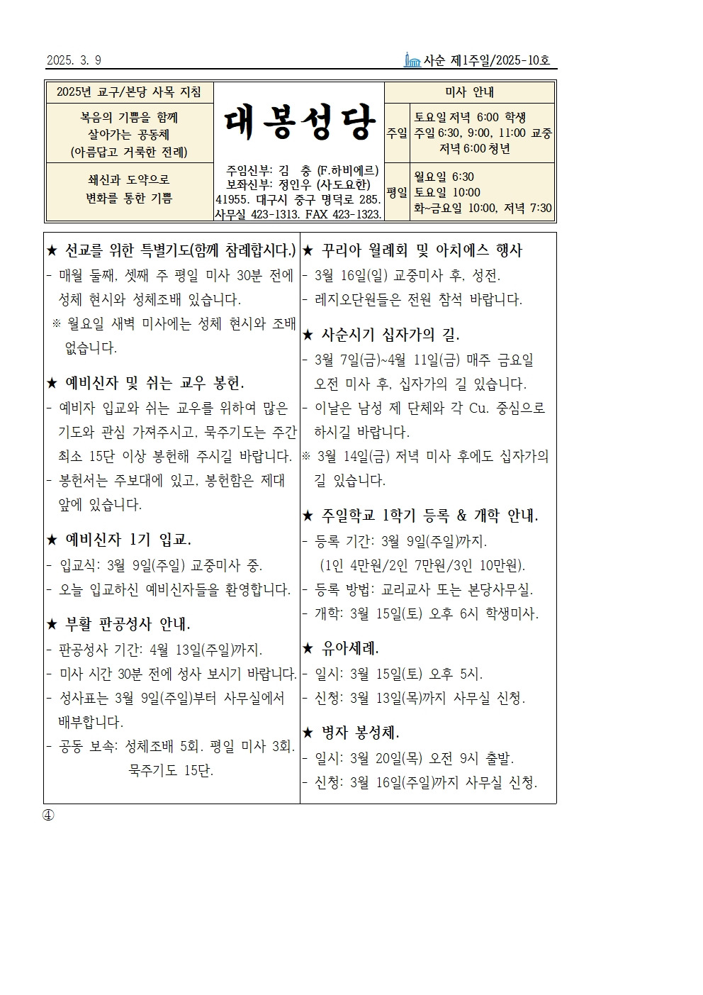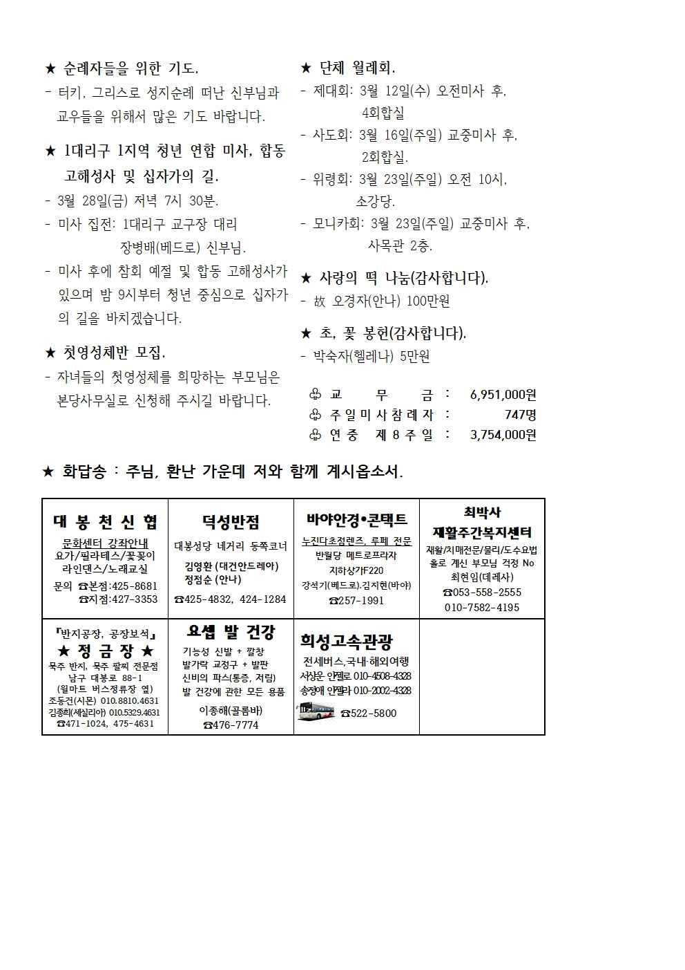 3월 9일 사순 제1주일 본당소식 입니다. 작성자사무원 레지나|작성시간25.03.07|조회수318 목록 댓글 1 글자크기 작게가 글자크기 크게가 다음검색 현재 게시글 추가 기능 열기 북마크 공유하기 신고 센터로 신고 댓글 댓글 1 댓글쓰기 답글쓰기 댓글 리스트 작성자류재현데미안 | 작성시간 25.03.08 감사드립니다. 댓글 전체보기