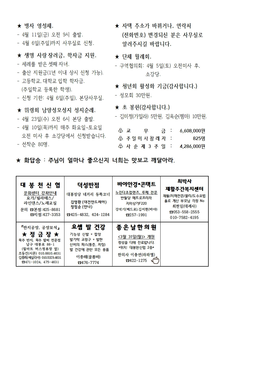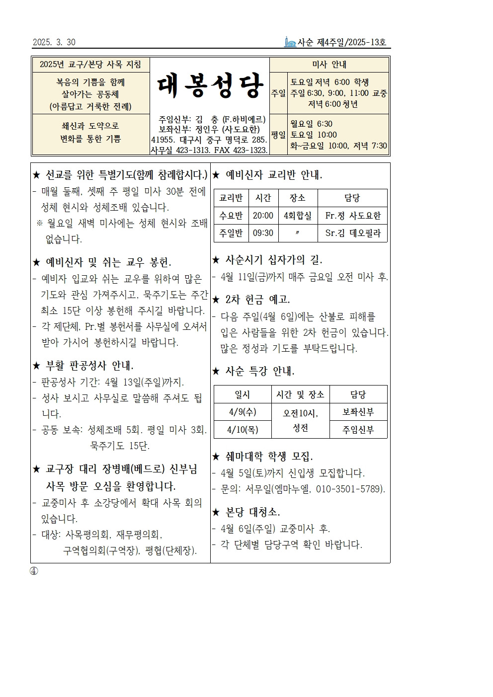 3월 30일 사순 제4주일 본당소식 입니다. 작성자사무원 레지나|작성시간25.03.28|조회수283 목록 댓글 0 글자크기 작게가 글자크기 크게가 다음검색 현재 게시글 추가 기능 열기 북마크 공유하기 신고 센터로 신고 댓글 댓글 0 댓글쓰기 답글쓰기 댓글 리스트