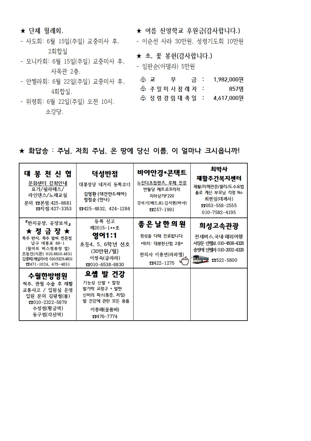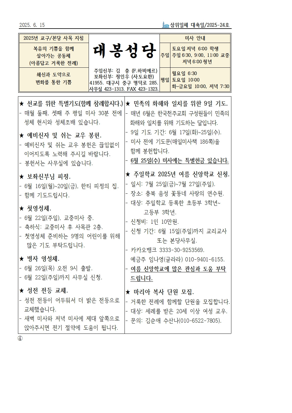 6월 15일 지극히 거룩하신 삼위일체 대축일 본당소식 입니다. 작성자사무원 레지나|작성시간25.06.13|조회수212 목록 댓글 1 글자크기 작게가 글자크기 크게가 다음검색 현재 게시글 추가 기능 열기 북마크 공유하기 신고 센터로 신고 댓글 댓글 1 댓글쓰기 답글쓰기 댓글 리스트 작성자류재현데미안 | 작성시간 25.06.14 감사드립니다. 댓글 전체보기