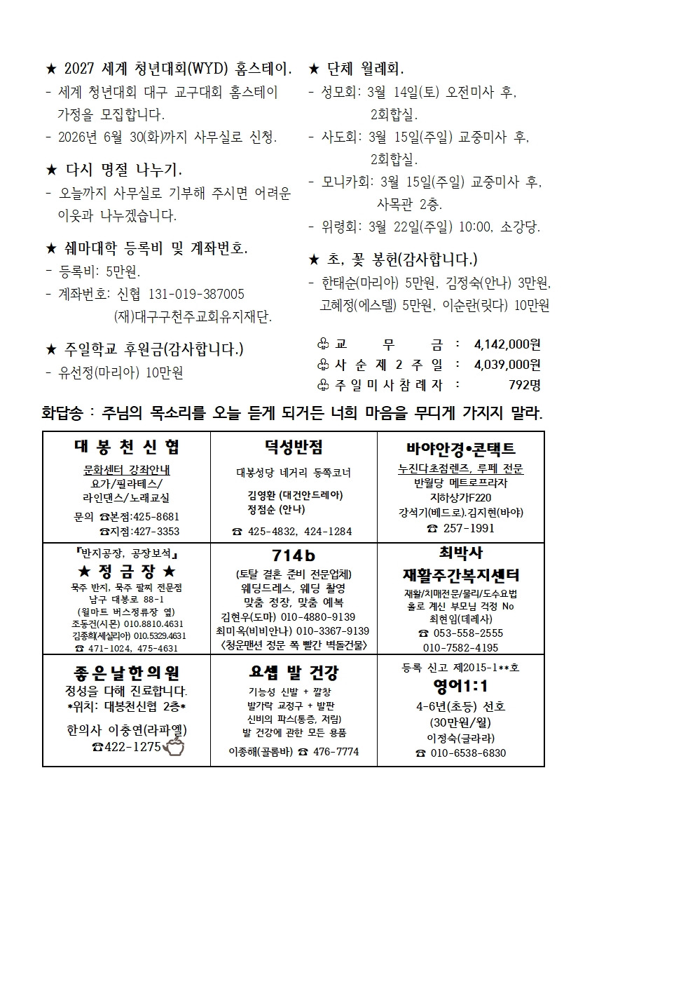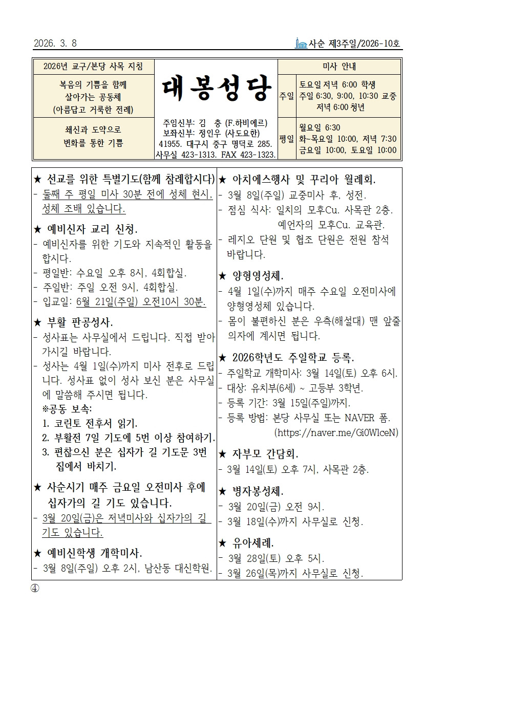 3월 8일 사순 제3주일 본당소식 입니다. 작성자사무장|작성시간26.03.11|조회수155 목록 댓글 1 글자크기 작게가 글자크기 크게가 다음검색 현재 게시글 추가 기능 열기 북마크 공유하기 신고 센터로 신고 댓글 댓글 1 댓글쓰기 답글쓰기 댓글 리스트 작성자류재현데미안 | 작성시간 26.03.12 감사드립니다. 댓글 전체보기