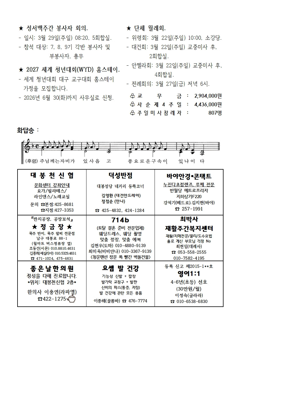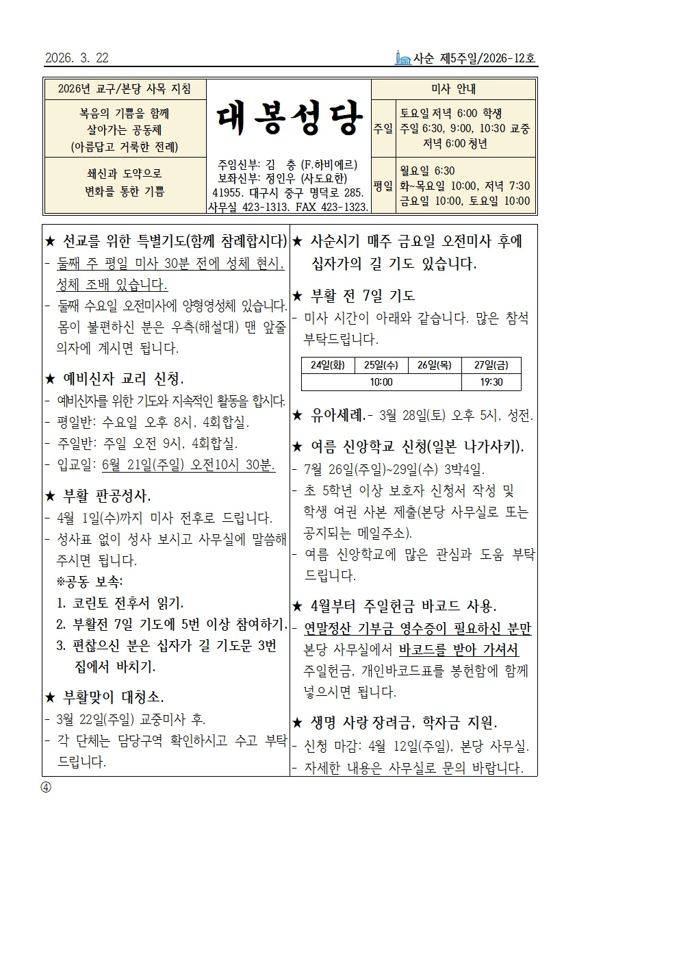 3월 22일 사순 제5주일 본당소식 입니다. 작성자사무원 레지나|작성시간26.03.20|조회수317 목록 댓글 1 글자크기 작게가 글자크기 크게가 다음검색 현재 게시글 추가 기능 열기 북마크 공유하기 신고 센터로 신고 댓글 댓글 1 댓글쓰기 답글쓰기 댓글 리스트 작성자류재현데미안 | 작성시간 26.03.20 감사드립니다. 댓글 전체보기
