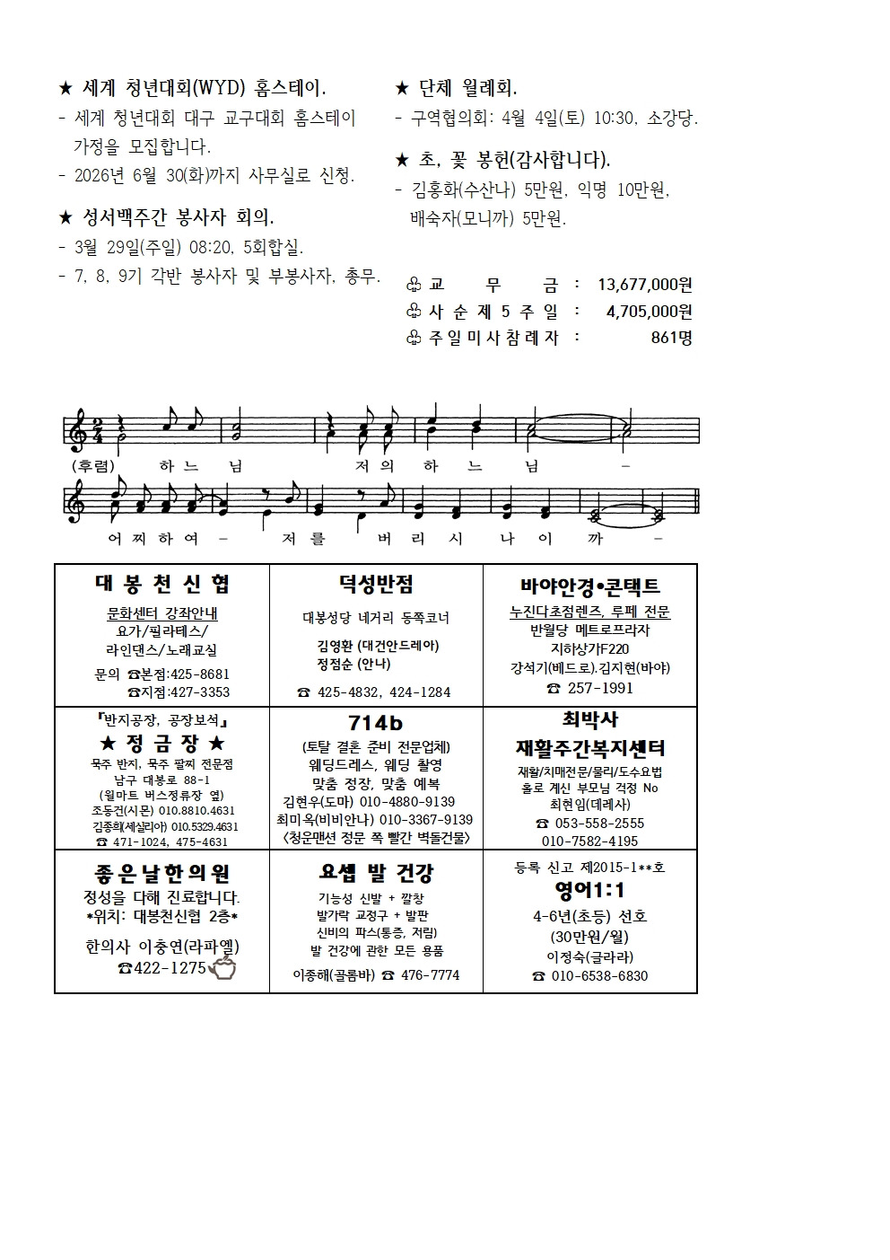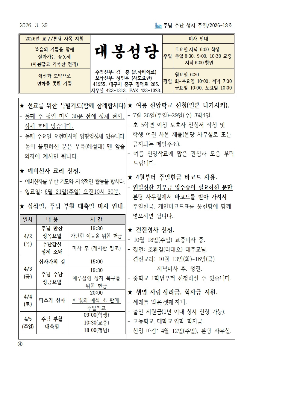 3월 28일 주님 수난 성지 주일 본당소식 입니다. 작성자사무원 레지나|작성시간26.03.27|조회수409 목록 댓글 1 글자크기 작게가 글자크기 크게가 다음검색 현재 게시글 추가 기능 열기 북마크 공유하기 신고 센터로 신고 댓글 댓글 1 댓글쓰기 답글쓰기 댓글 리스트 작성자류재현데미안 | 작성시간 26.03.28 감사드립니다 댓글 전체보기