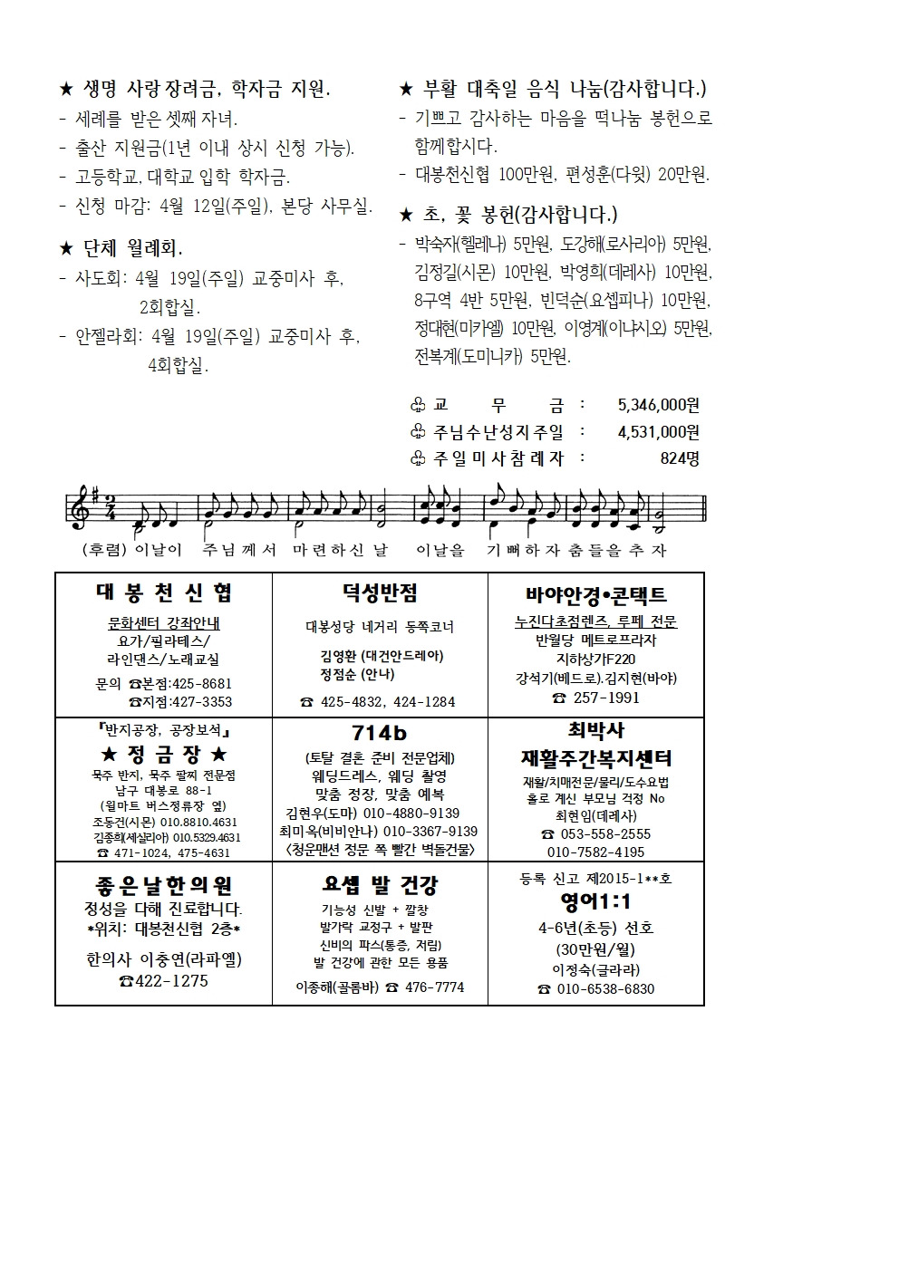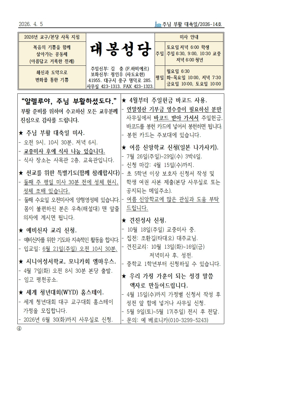 4월 5일 주님 부활 대축일 본당소식 입니다. 작성자사무원 레지나|작성시간26.04.03|조회수309 목록 댓글 1 글자크기 작게가 글자크기 크게가 다음검색 현재 게시글 추가 기능 열기 북마크 공유하기 신고 센터로 신고 댓글 댓글 1 댓글쓰기 답글쓰기 댓글 리스트 작성자류재현데미안 | 작성시간 26.04.05 감사드립니다 댓글 전체보기