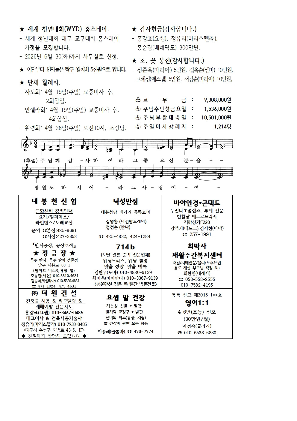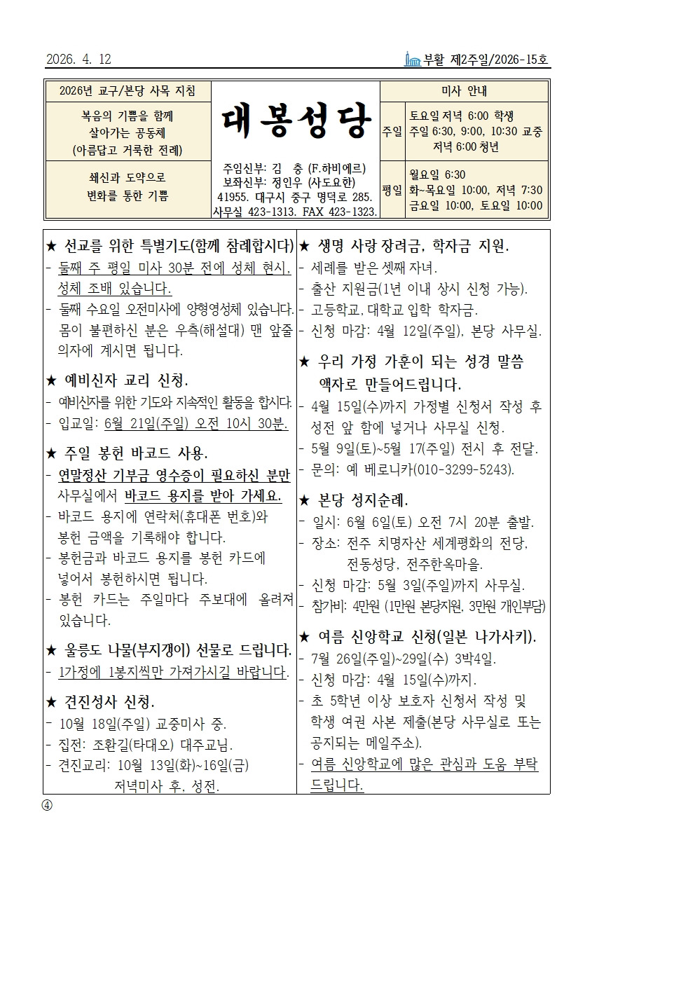 4월 12일 부활 제2주일 본당소식 입니다. 작성자사무원 레지나|작성시간26.04.10|조회수208 목록 댓글 1 글자크기 작게가 글자크기 크게가 다음검색 현재 게시글 추가 기능 열기 북마크 공유하기 신고 센터로 신고 댓글 댓글 1 댓글쓰기 답글쓰기 댓글 리스트 작성자류재현데미안 | 작성시간 26.04.10 감사드립니다. 댓글 전체보기