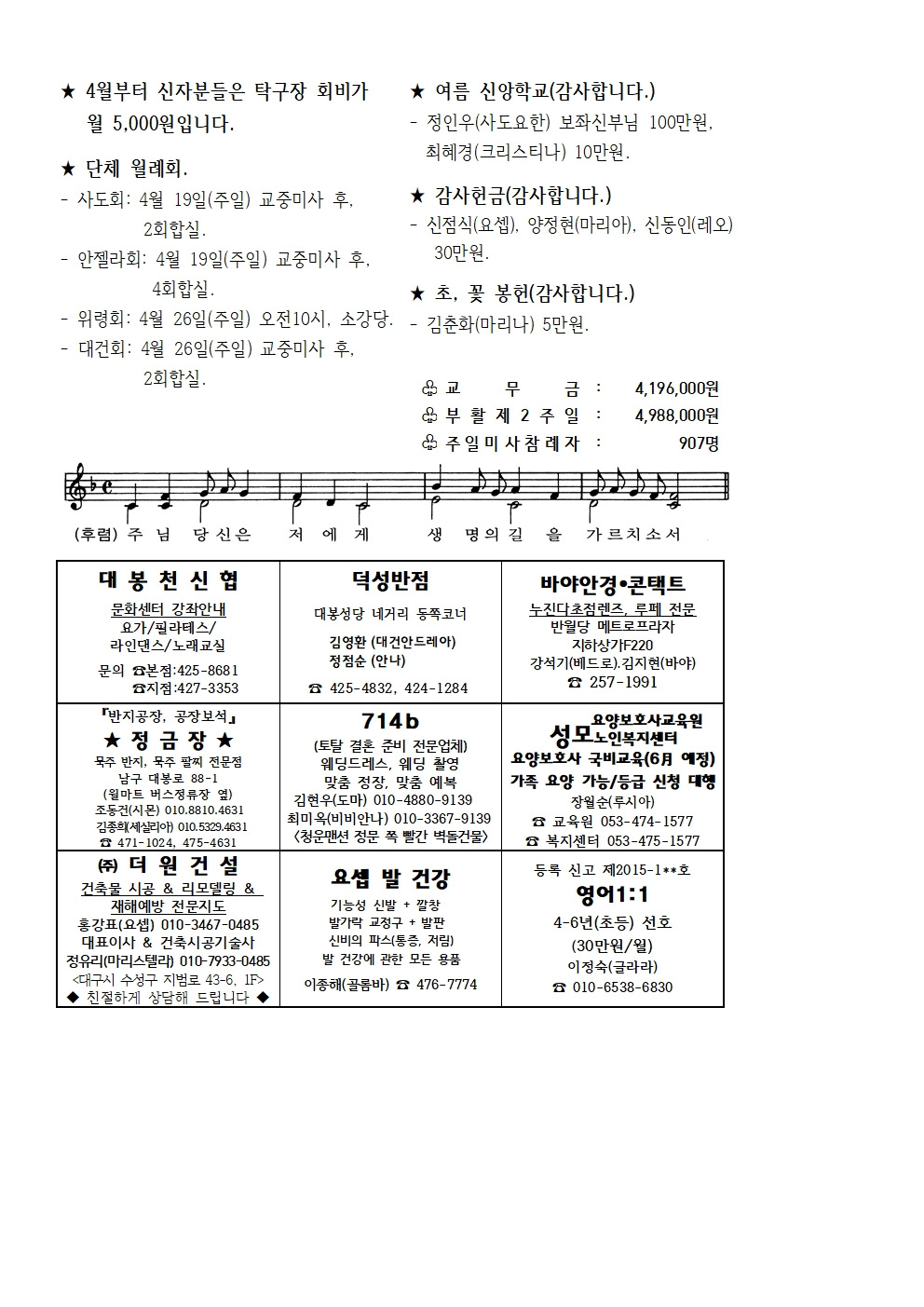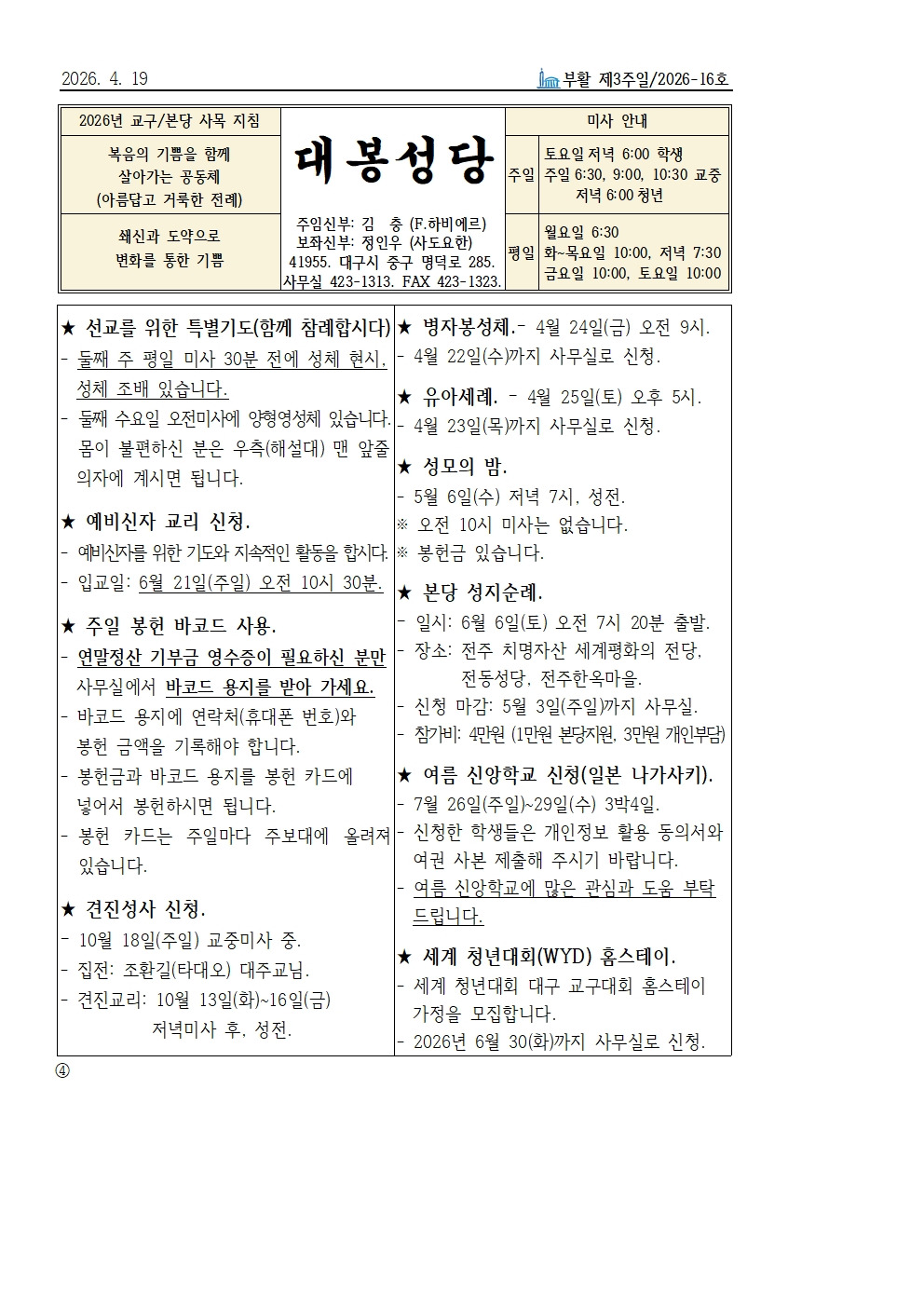 4월 19일 부활 제3주일 본당소식 입니다. 작성자사무원 레지나|작성시간26.04.17|조회수218 목록 댓글 1 글자크기 작게가 글자크기 크게가 다음검색 현재 게시글 추가 기능 열기 북마크 공유하기 신고 센터로 신고 댓글 댓글 1 댓글쓰기 답글쓰기 댓글 리스트 작성자류재현데미안 | 작성시간 26.04.17 감사드립니다. 댓글 전체보기