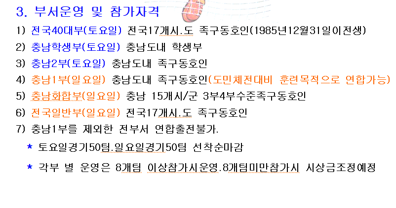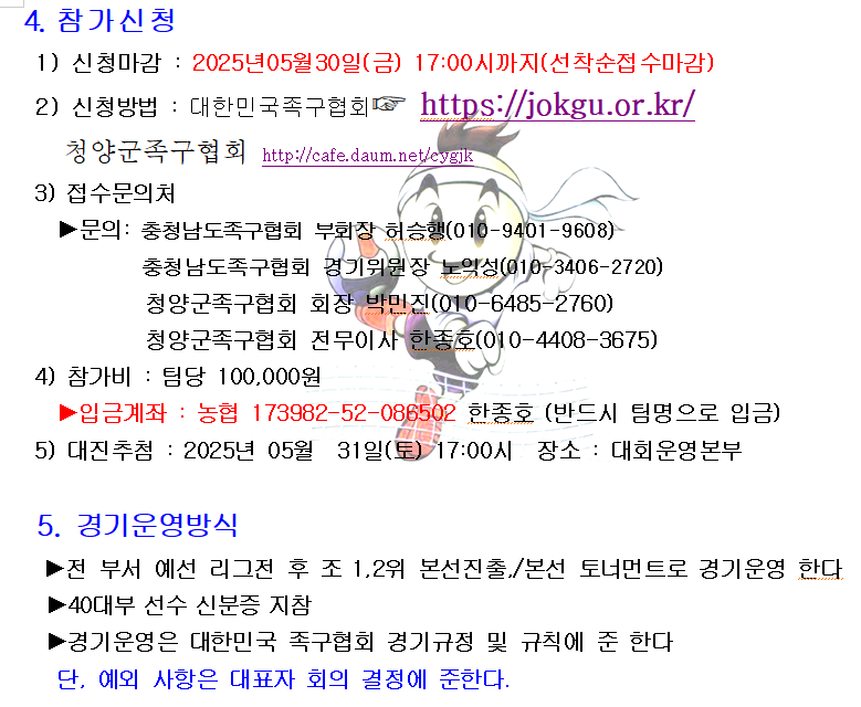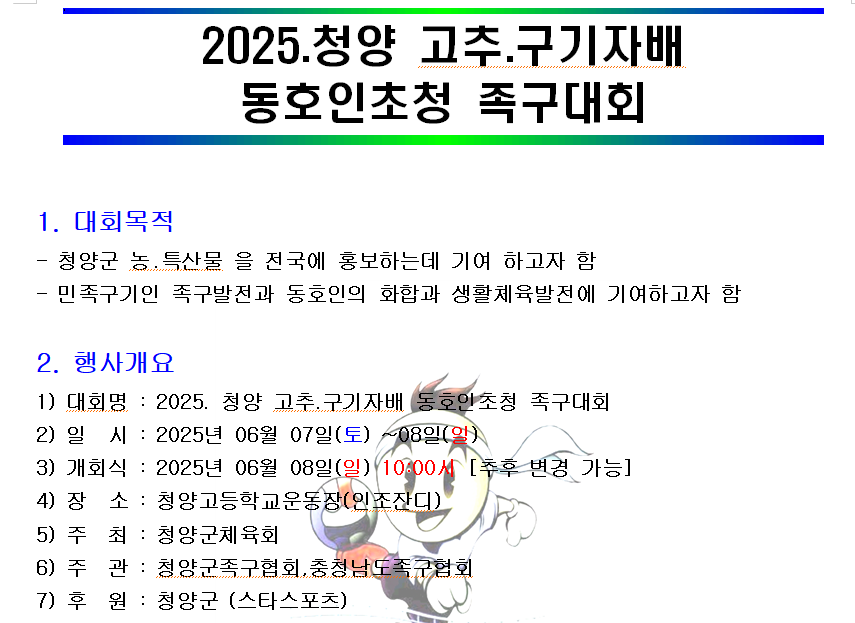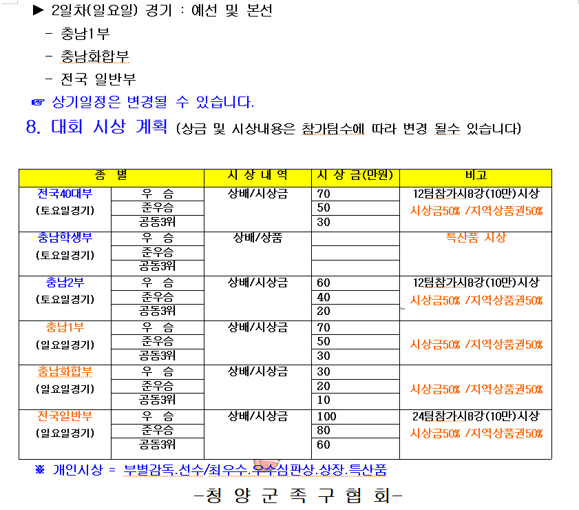 2025. 청양 고추.구기자배 족구대회 대회요강 입니다. 작성자한종호|작성시간25.04.30|조회수36 목록 댓글 0 글자크기 작게가 글자크기 크게가 많은 참여 부탁드립니다. 다음검색 현재 게시글 추가 기능 열기 북마크 공유하기 신고 센터로 신고 댓글 댓글 0 댓글쓰기 답글쓰기 댓글 리스트