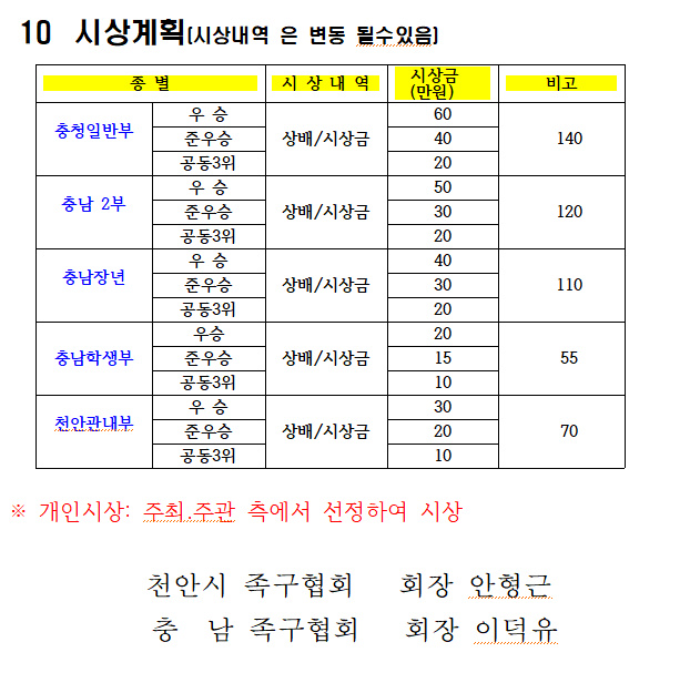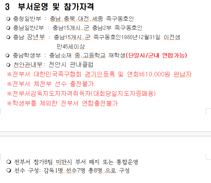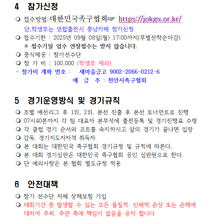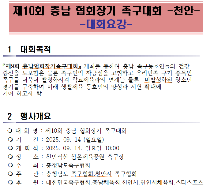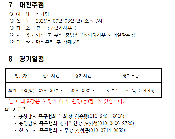 [스크랩] 제10회 충남협회장기 족구대회 작성자충남홍보이사/이홍묵#|작성시간25.08.18|조회수21 목록 댓글 0 글자크기 작게가 글자크기 크게가 제10회충남협회장기 족구대회 대회요강(최종수정본).hwp81.00KB 첨부파일첨부된 파일이 7개 있습니다. png 파일 1.png 다운로드 png 파일 2.png 다운로드 png 파일 3.png 다운로드 png 파일 4.png 다운로드 png 파일 5.png 다운로드 png 파일 6.png 다운로드 hwp 파일 제10회충남협회장기 족구대회 대회요강(최종수정본).hwp 다운로드 다음검색 스크랩 원문 : 충청남도족구협회 현재 게시글 추가 기능 열기 북마크 공유하기 신고 센터로 신고 댓글 댓글 0 댓글쓰기 답글쓰기 댓글 리스트