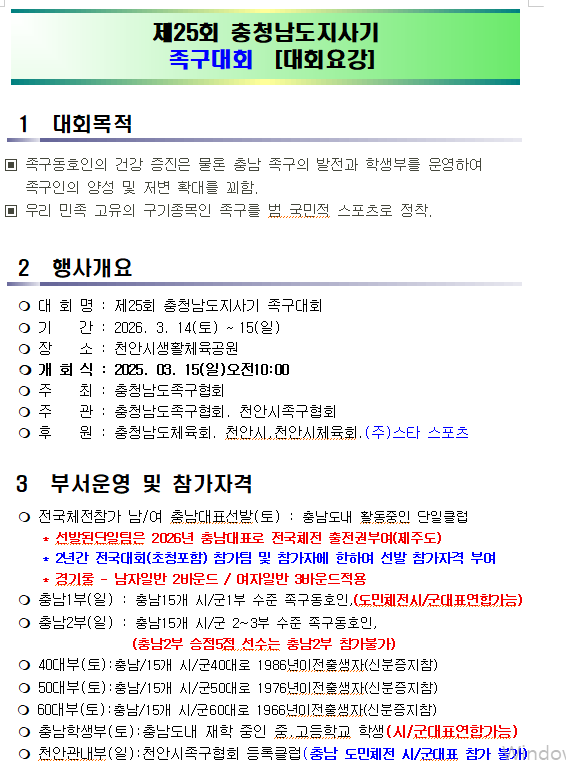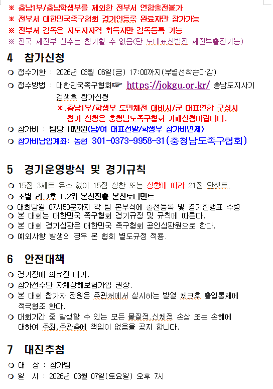 [스크랩] 제25회충남도지사기(대회요강) 작성자충남홍보이사/이홍묵#|작성시간26.02.11|조회수11 목록 댓글 0 글자크기 작게가 글자크기 크게가 다음검색 스크랩 원문 : 충청남도족구협회 현재 게시글 추가 기능 열기 북마크 공유하기 신고 센터로 신고 댓글 댓글 0 댓글쓰기 답글쓰기 댓글 리스트