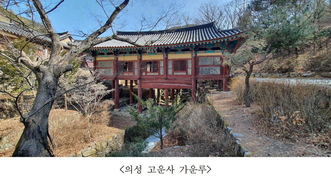 한편, 의성 고운사는 의상대사에 의해 신라시대 때 창건된 사찰로 전해지며, 「의성 고운사 가운루」는 「고운사사적비(孤雲寺事蹟碑, 1729년)」, 「고운사사적비(孤雲寺事蹟碑, 1918년)」 등의 문헌사료를 통해 1668년에 건립되었음을 확인할 수 있다.