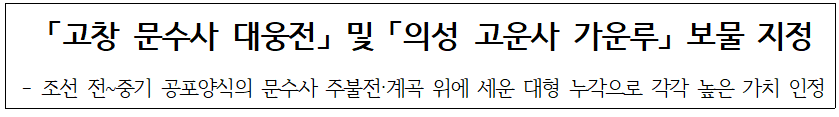 「고창 문수사 대웅전」 및 「의성 고운사 가운루」 보물 지정 - 조선 전~중기 공포양식의 문수사 주불전·계곡 위에 세운 대형 누각으