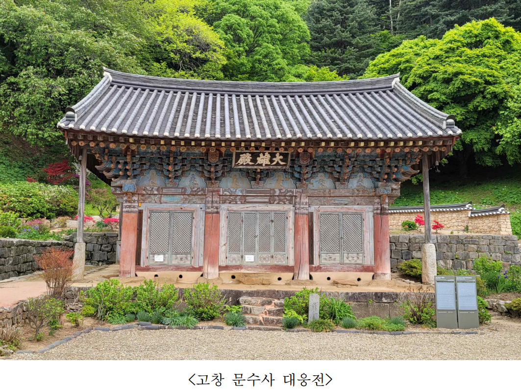 ㅇ「고창 문수사 대웅전」은 정면 3칸, 측면 2칸이며, 포작은 내외 3출목 다포형식으로 공포의 형태와 짜임은 단순하면서도 강직한 조선 전기∼중기에 이르는 양식과 전라도의 지역적 특색이 나타나고 있고, 1653년(효종 4) 중창 당시의 모습을 상당부분 유지하고 있어 학술적 가치가 크다.