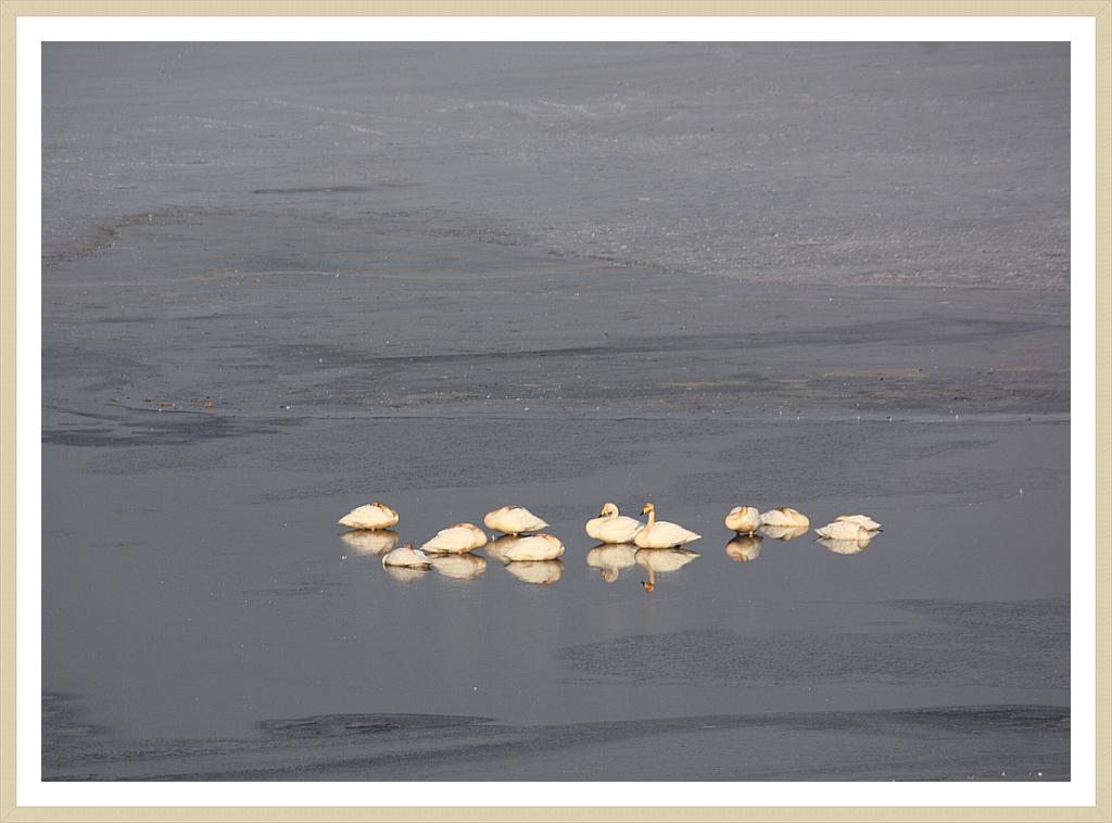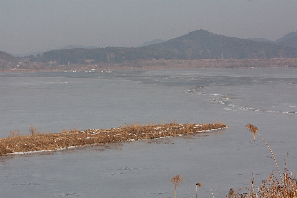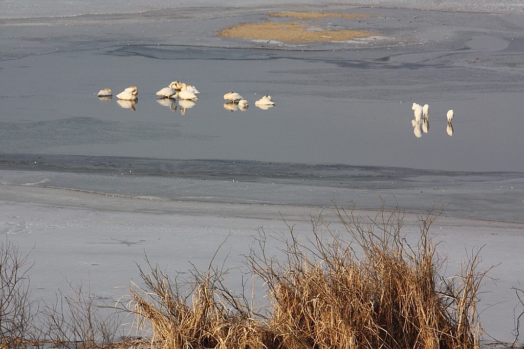 늪지대는 온통 두꺼운 얼음으로 뒤덮혔다. 그래서인지 새들은 늪지대 가운데 자리에 옹기종기 모여 앉았다.