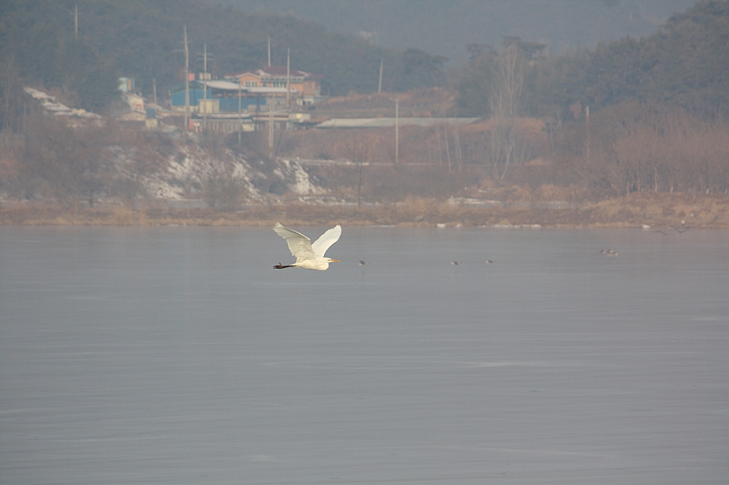 길다란 제방을 걷다보니 건너편 논밭들이 눈에 덮혀 하얀 빙판길 같다.