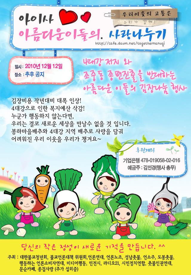4대강저지 및 조중동 종편진출 반대를 위한 김장나누기 작성자해골|작성시간10.11.11|조회수20 목록 댓글 0 글자크기 작게가 글자크기 크게가 다음검색 현재 게시글 추가 기능 열기 북마크 공유하기 신고 센터로 신고 댓글 댓글 0 댓글쓰기 답글쓰기 댓글 리스트
