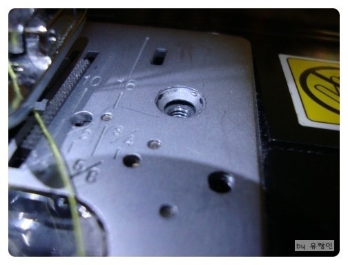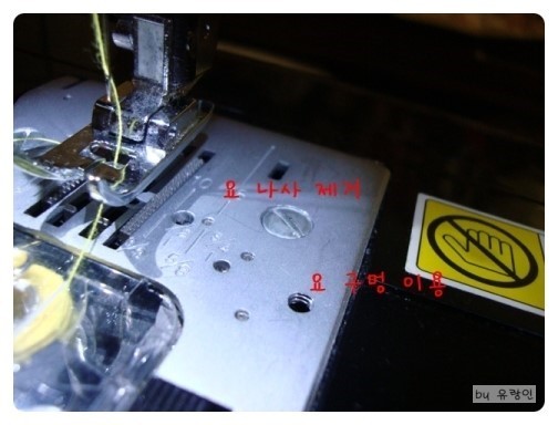 미싱 침판에 보시면 구멍이 한개 뚫려있고(없을 수도 있어요) 뒤에 나사가 있어요.
