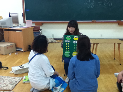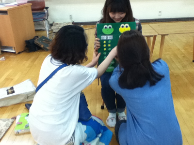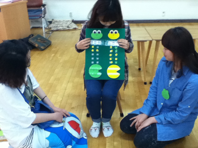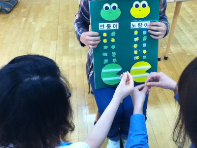 게임이 끝난후 밑에 있는 큰연꽃판에 하나씩 옮겨가며 각자 가져온 연꽃잎을 친구들과 함께 큰소리로 세어본다.