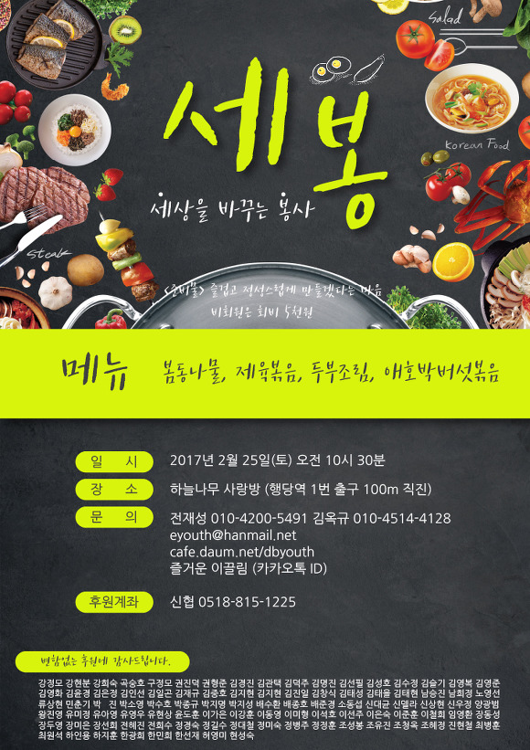 2월 25일 반찬봉사 함께 해요!! 작성자e끌림공식메일|작성시간17.02.24|조회수49 목록 댓글 0 글자크기 작게가 글자크기 크게가 다음검색 현재 게시글 추가 기능 열기 북마크 공유하기 신고 센터로 신고 댓글 댓글 0 댓글쓰기 답글쓰기 댓글 리스트