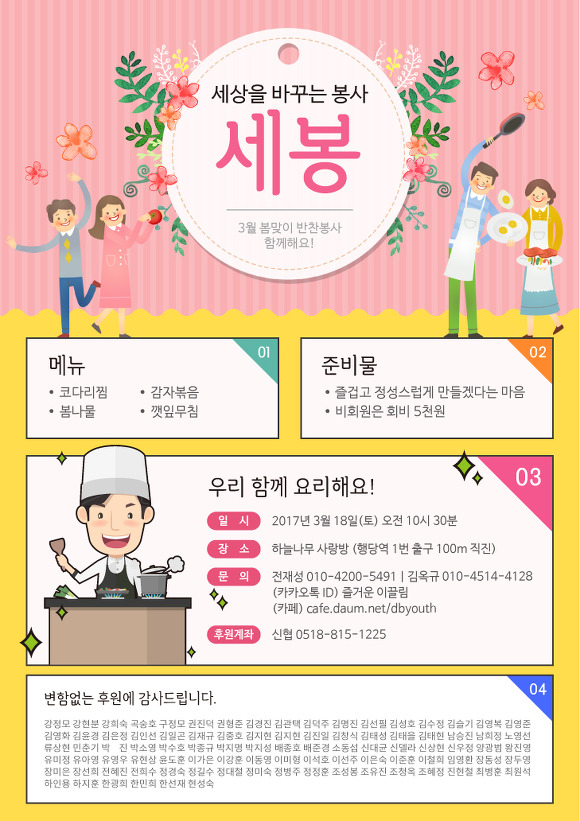 3얼 18일(토) 반찬봉사 함께 해요!! 작성자e끌림공식메일|작성시간17.03.13|조회수51 목록 댓글 0 글자크기 작게가 글자크기 크게가 다음검색 현재 게시글 추가 기능 열기 북마크 공유하기 신고 센터로 신고 댓글 댓글 0 댓글쓰기 답글쓰기 댓글 리스트