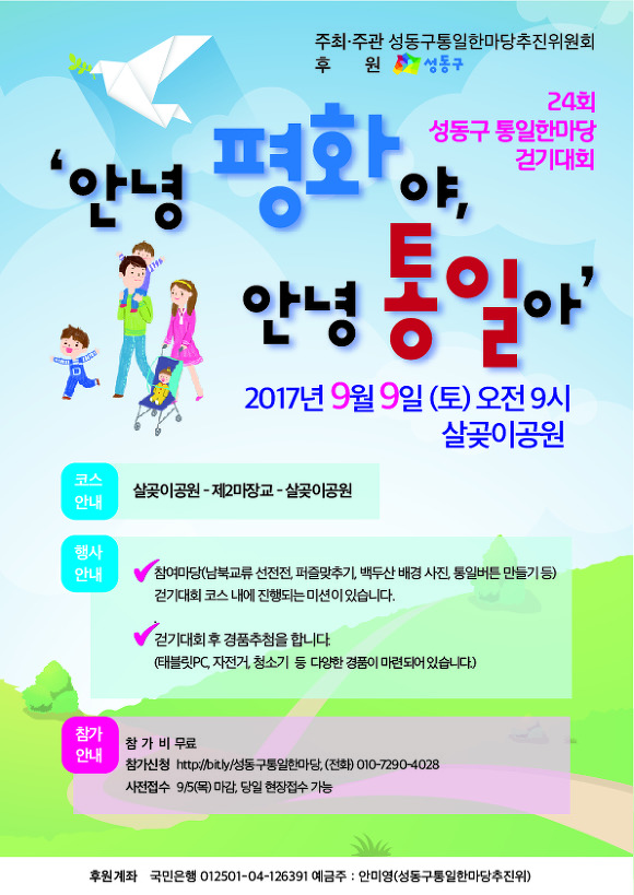 24회 성동구통일한마당 걷기대회 행사에 함께 참여해 주세요! 작성자e끌림공식메일|작성시간17.08.23|조회수160 목록 댓글 0 글자크기 작게가 글자크기 크게가 <24회 성동구 통일한마당 '안녕 평화야, 안녕 통일아' 걷기대회 안내> 일시 및 장소 : 9월 9일(토) 오전9시 살곶이공원 성동구 통일한마당 걷기대회 신청 주소 http://bit.ly/성동구통일한마당 다음검색 현재 게시글 추가 기능 열기 북마크 공유하기 신고 센터로 신고 댓글 댓글 0 댓글쓰기 답글쓰기 댓글 리스트