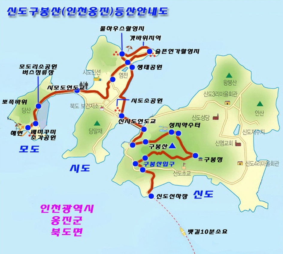 ◎ 산행코스 : 신도선착장 ~ 구봉산입구 ~ 구봉정 ~ 구봉산(인증장소) ~ 신시도연도교 ~ 슬픈연가촬영지 ~ 풀하우스촬영지~ 시모도연도교 ~ 배미꾸미조각공원~마을버스로 신도 선착장 이동 (12.7km/약4시간30분)