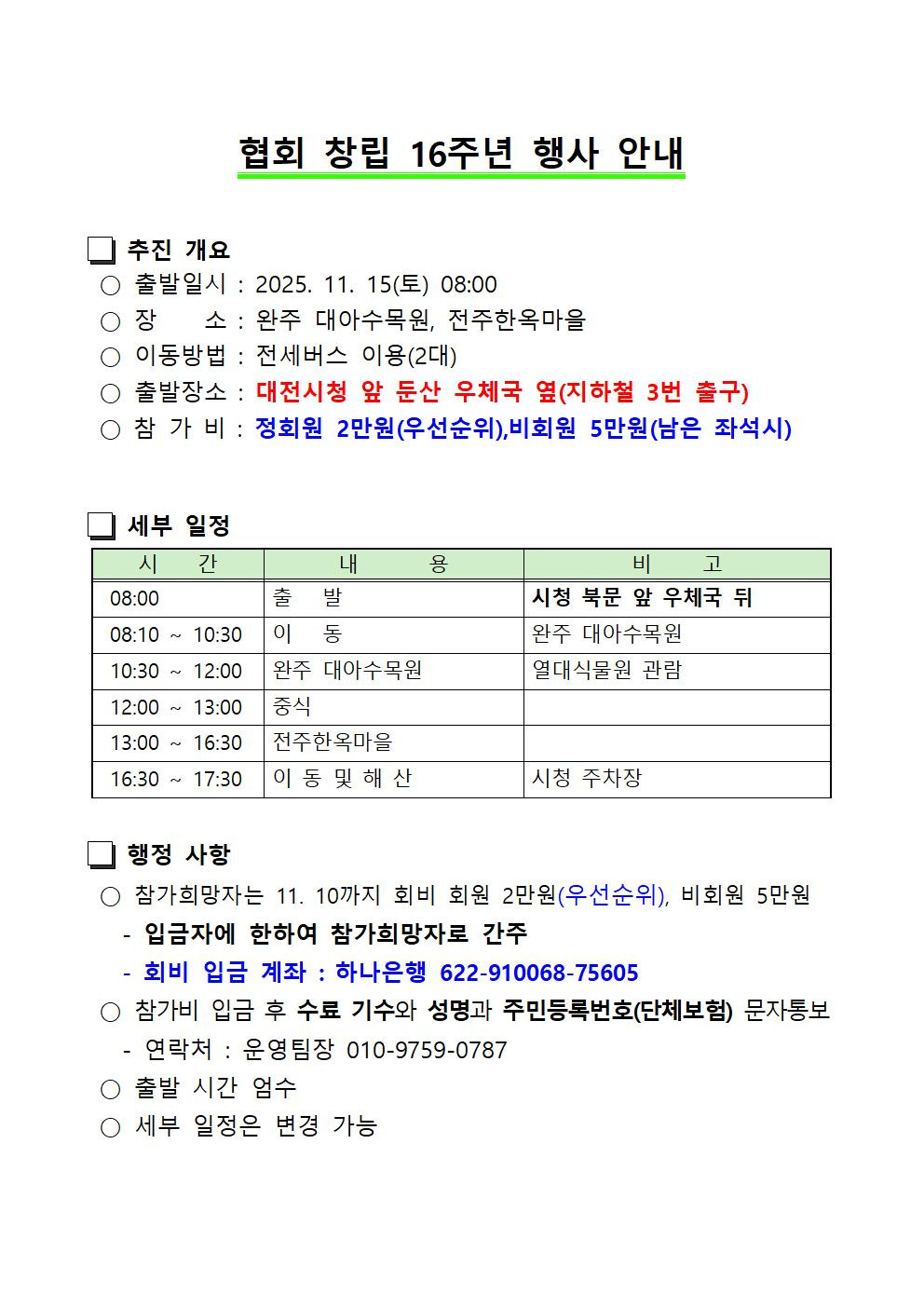| 우리협회 창립16주년 기념행사를 붙임과 같이 계획하고 있습니다. 회원님들의 많은 관심과 참여를 당부드립니다. ※ 출발장소 : 대전 시청 북문 앞 대전 둔산우체국 옆 도로 (지하철 3번 출구) ※ 댓글로 참여 신청 바랍니다.(번호/기수/성명) 선착순 마감(차량 2대 선착순 80명, 정회원 우선순위) |