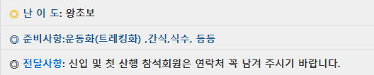 | 준비물 | ● 발전 후원금 : 1000 ● 식수, 중식,간식, 즐거운 마음, 기타 개인 필요품(스틱..등등) ※ 겨울 산행은 아이젠 필수 ※ 안전사고 및 저체온증 등에 대비해서 개인별로 철저히 준비해 주십시요 ● 발전 후원금 1000원은 산방 발전에 사용 됩니다 |