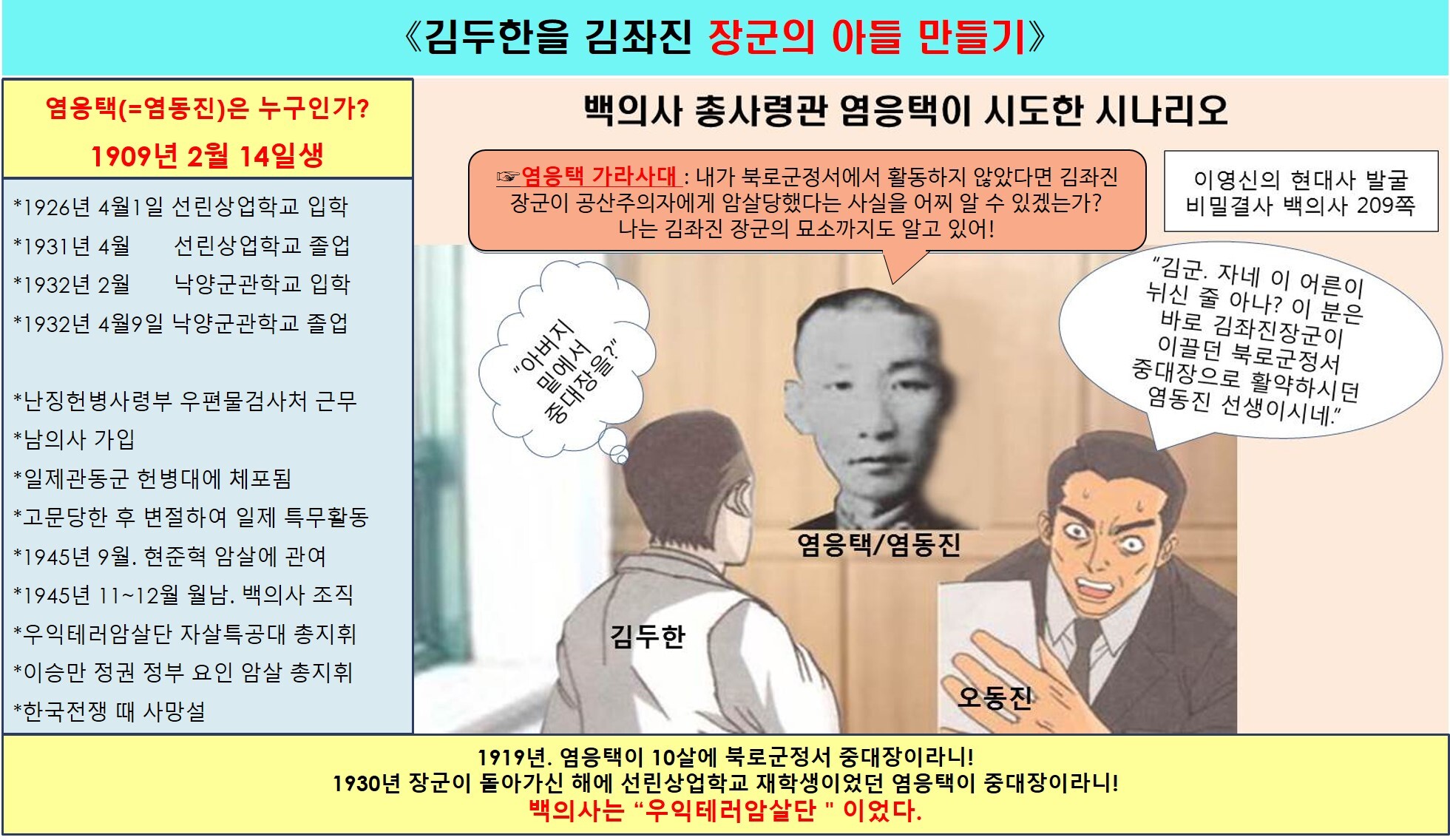 이 인용문에서 나타나는 장면들은 작가 이영신의 의도가 아니라 이영신이 발굴한 현대사의 한 장면이다. 현대사라는 역사의 한 페이지이다. 염응택이 고안한 각본이 아니고서야 이런 연출은 쉽게 형성될 수 없다. 한마디로 잘라 말해서 1909년에 태어나 1931년에 선린상업학교를 졸업한 염응택이 어떻게 10살이 되던 1919년에 북로군정서에서 중대장으로 활동했단 말인가? 장군이 순국하시던 1930년에는 선린상업학교 재학생이었잖은가 말이다. 이렇게 하늘과 땅이 뒤바뀔 거짓 시나리오로 김두한은 장군의 아들로 해방정국에서 활개를 치게 된 것이다. 이렇게 김두한을 김좌진 장군의 아들로 변신시킨 것은 염응택(=염동진)이었고, 기고만장한 김두한은 10년이 지난 뒤에 장군의 오숙근 여사 유령 장례식, 유택조작, 김좌진의 아들로 보훈처 등재 등의 작업을 서슴없이 진행했다.