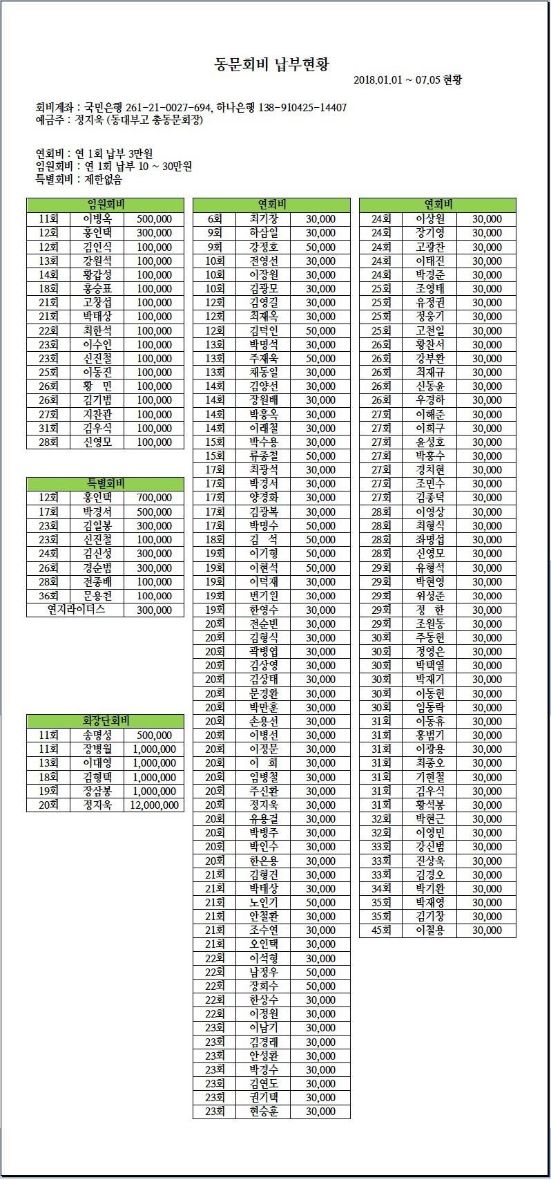 동대부고 총동문회 동문회비 납부안내 및 납부현황 (2018. 7. 05 현황)