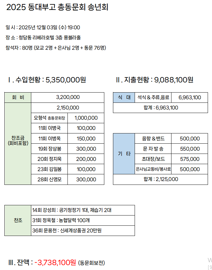 [행사후기]2025 동대부고 총동문회 송년회 결산내역 작성자동대부고총동문회|작성시간25.12.30|조회수86 목록 댓글 0 글자크기 작게가 글자크기 크게가 참석한 동문 여러분 진심으로 감사드립니다. 다음검색 현재 게시글 추가 기능 열기 북마크 공유하기 신고 센터로 신고 댓글 댓글 0 댓글쓰기 답글쓰기 댓글 리스트