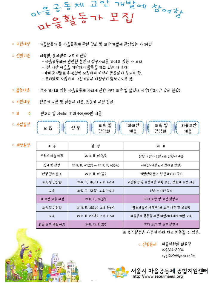 마을공동체 교안개발 마을활동가 모집 작성자maeul:D|작성시간12.10.31|조회수16 목록 댓글 0 글자크기 작게가 글자크기 크게가 첨부파일첨부된 파일이 2개 있습니다. jpg 파일 마을공동체 교안개발 마을활동가 모집.jpg 다운로드 jpg 파일 7o9v68t9k.jpg 다운로드 다음검색 현재 게시글 추가 기능 열기 북마크 공유하기 신고 센터로 신고 댓글 댓글 0 댓글쓰기 답글쓰기 댓글 리스트