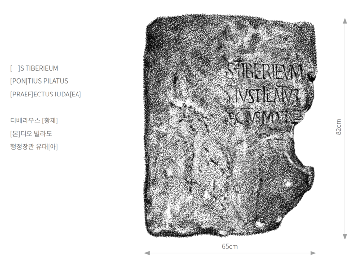 빌라도는 수수께끼 같은 인물이지만, 가이사랴에 거주하였던 역사적인 인물이라는 것은 분명합니다. 그의 이름이 언급된 역사적인 기록물뿐만 아니라, 그의 이름이 새겨진 석비(石碑)도 발굴이 되었습니다. 1961년 가이사랴를 발굴하던 이탈리아 고고학자 프로바(Antonio Frova)가 극장을 발굴하던 중 무대를 오르내리던 계단에 라틴어가 새겨져 있는 것을 보고서 확인해보니, 본디오 빌라도가 티베리우스 황제 시절에 새겨 놓은 석비라는 것을 알게 되었습니다. 가이사랴가 무너진 뒤 기원후 4세기에 다시 도시를 재건하면서 극장의 무대를 오르내리던 계단으로 재사용되었던 것입니다.