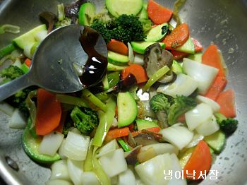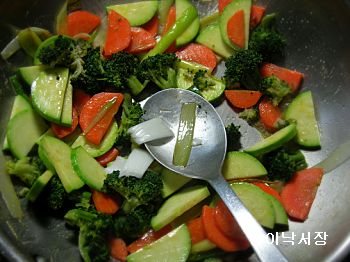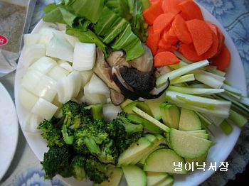 재료:양파 반개,브로콜리 한움큼,호박반개,대파2개,당근1개,청경채3송이,표고버섯2개,두부반모,
