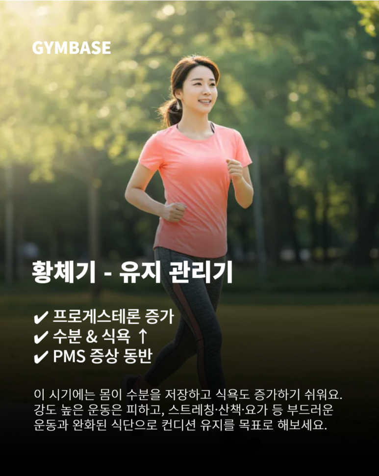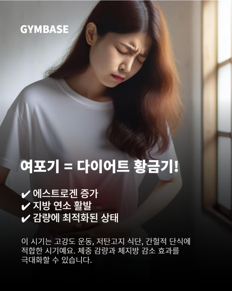 | 여포기 (1~2주차) | 에스트로겐↑, 지방 연소 효율↑ | 고강도 훈련, 유산소+근력 병행 | 저탄고지, 간헐적 단식 병행 |