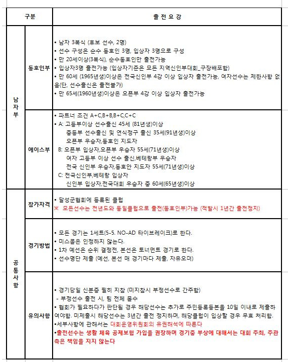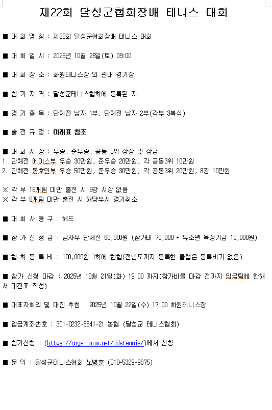 제22회 달성군협회장배 생활체육 테니스 대회(에이스 요강 수정) 작성자수수|작성시간25.09.16|조회수564 목록 댓글 0 글자크기 작게가 글자크기 크게가 아래 와 같이 달성군협회장배 테니스대회를 개최합니다.달성군 테니스 동호인을 모시고 우리들만의 축제의 장을 만들고자합니다.많은 관심과 참여 부탁드립니다 다음검색 현재 게시글 추가 기능 열기 북마크 공유하기 신고 센터로 신고 댓글 댓글 0 댓글쓰기 답글쓰기 댓글 리스트