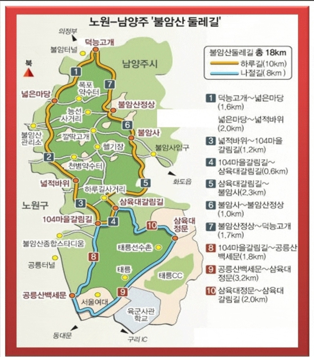 | ▶도보코스 | ▷ 코스 : 하계역 - 잣나무숲길 - 경춘선숲길 - 화랑대역 - 백세문 - 백사마을 - 학도암갈림길 - 여근석(넓적바위) - 공룡바위(영신여고) - 불암산EV전망대 - 남근석 - 상계역 ▷ 걷는거리 : 9km 내외 ▷ 걷는시간 : 4시간 이내 ▷ 난이도 : 하, 숲길 그늘길 위주입니다 |