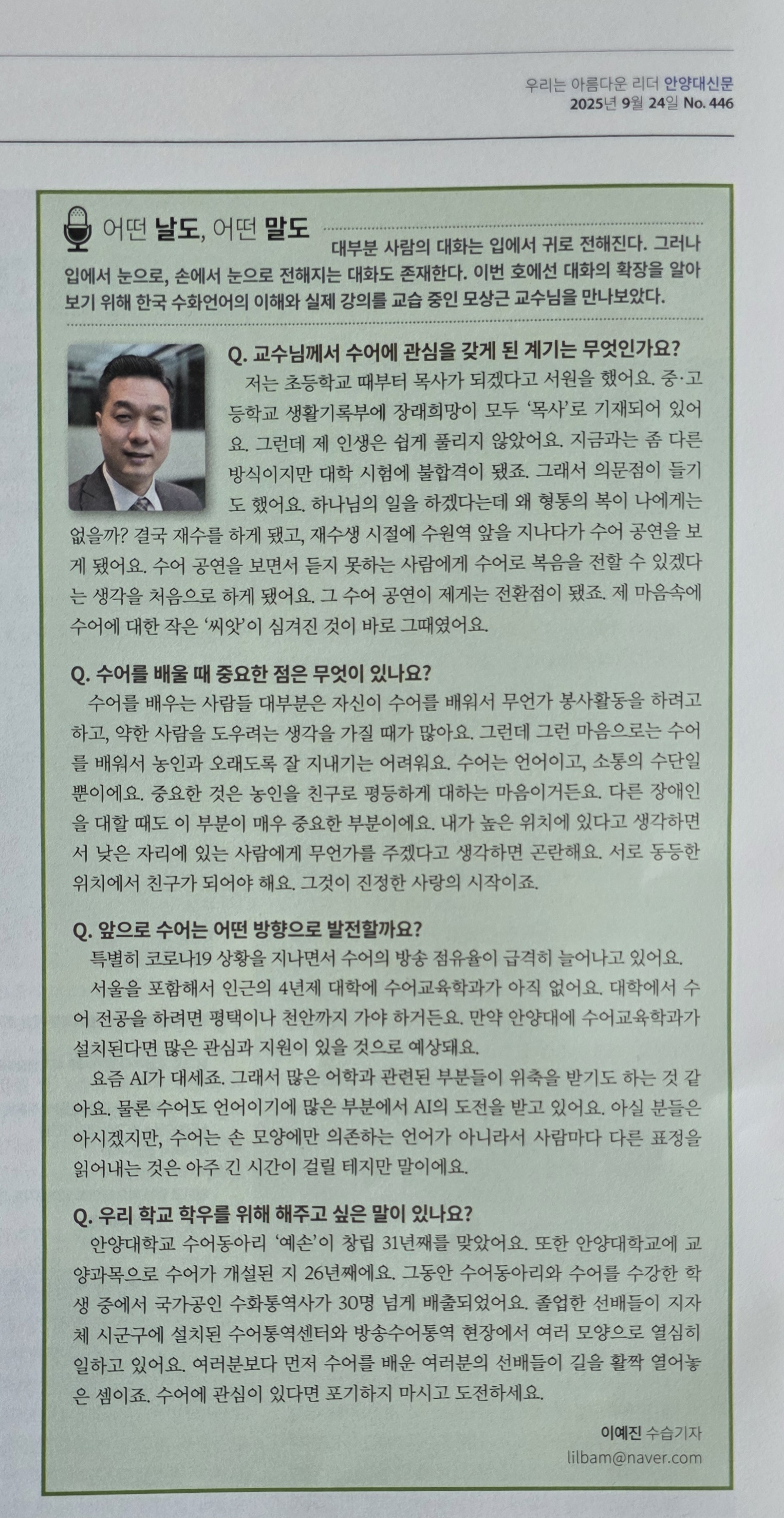 모상근 목사_안양대 신문 인터뷰 기사 작성시간25.10.04|조회수27 목록 댓글 1 글자크기 작게가 글자크기 크게가 다음검색 현재 게시글 추가 기능 열기 북마크 신고 센터로 신고 댓글 댓글 1 댓글쓰기 답글쓰기 댓글 리스트 작성시간 25.10.07 모교수님 너무좋아요.. 댓글 전체보기