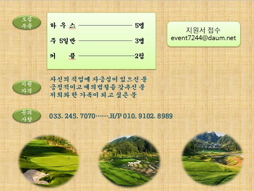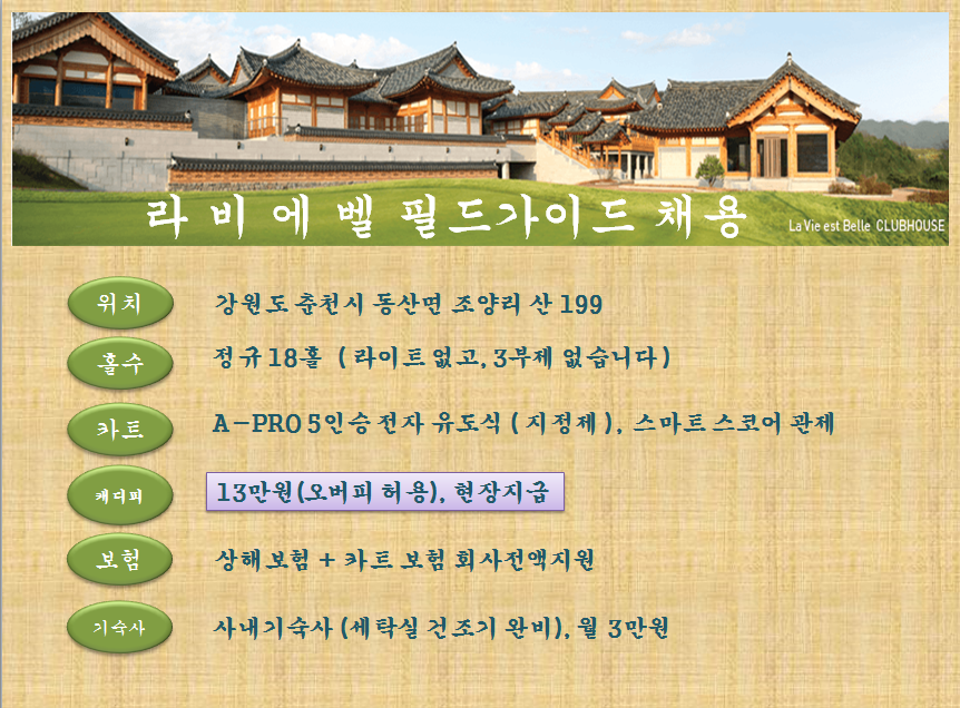 [경력/ 여+커플][춘천] 라비에벨 올드코스/ 하우스/ 주5일/주말반 모집합니다. 작성자라비에벨|작성시간19.04.10|조회수316 목록 댓글 0 글자크기 작게가 글자크기 크게가 다음검색 현재 게시글 추가 기능 열기 북마크 공유하기 신고 센터로 신고 댓글 댓글 0 댓글쓰기 답글쓰기 댓글 리스트
