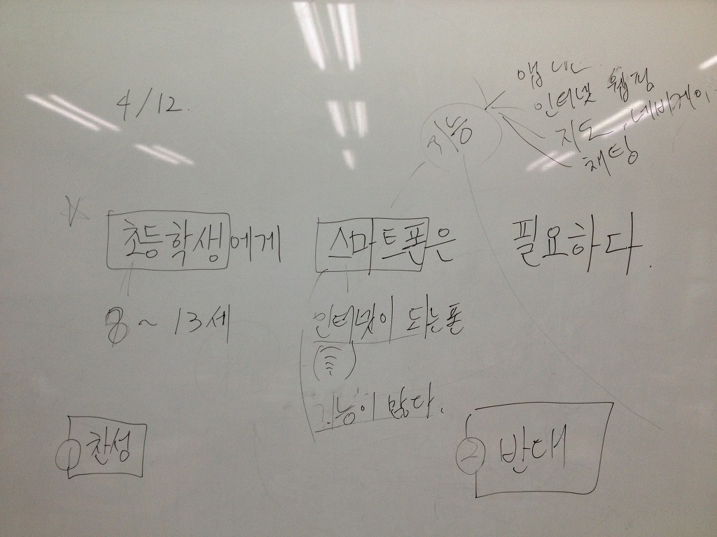 한 모둠에 3명이 있는 곳에 나도 들어가 함께 한다. 나와 붙은 성민이가 열심히 조리있게 자기 주장 잘 펼친다. 요 녀석 봐라. 준비하지 못한 내가 좀 밀린다.