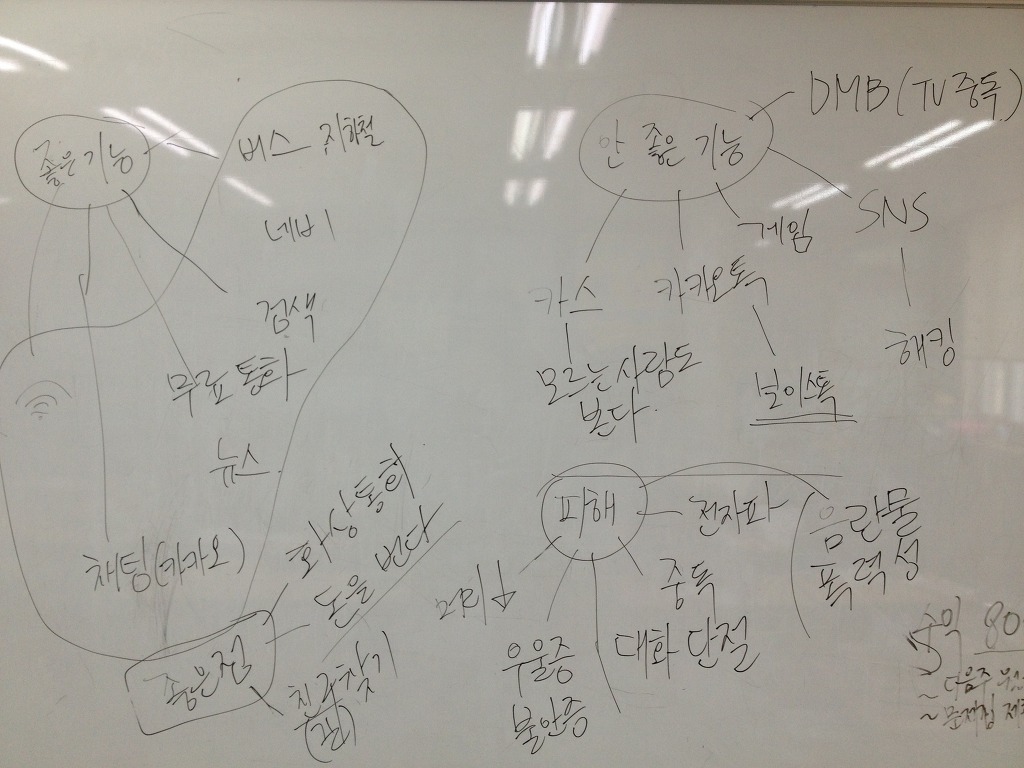 너무 많은 이야기 오고간다. 그래서 장점과 단점으로 나누어 칠판에 적어 본다. 아이들은 좋은 점보다 안 좋은 점을 더 많이 이야기 나눈다.