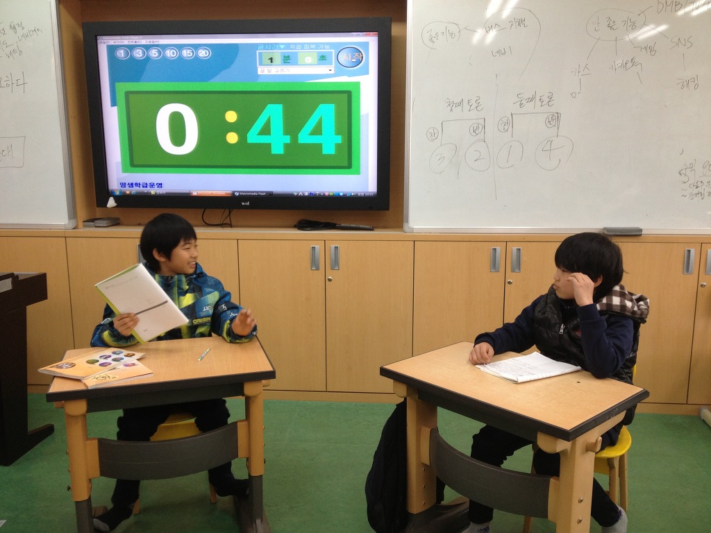모둠토론 마치고 남은 5분. 건희와 태형이를 교실 앞으로 부른다. 두 친구가 토론하는 모습을 아이들에게 보여준다. 잘한다. 더 많이 연습해보면 더 잘 할 것 같다.
