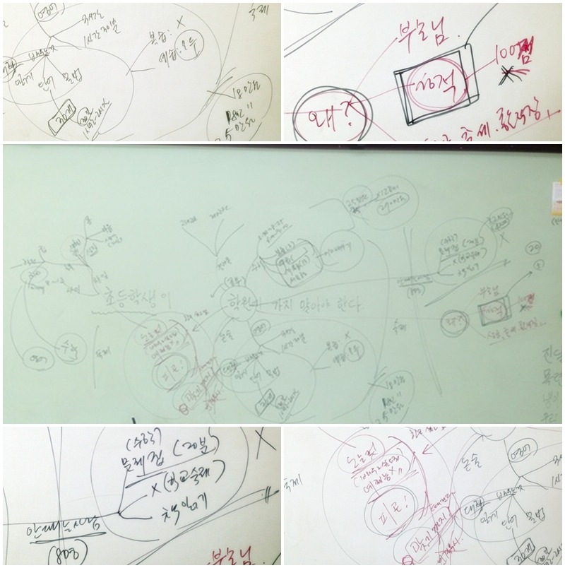 지난번과 마찬가지로 ‘초등학생이 하는 것’을 찾으니 가지가 여럿이 나온다. ‘놀기’, ‘성장-몸과 마음’, ‘공부’로 나온다. 논제인 학원과 모두 관련이 있다. 학원에 다니면 놀아야 하는 것과 맞지 않다. 몸과 마음이 제대로 커야 하는데 학원이 그럴 수 있을까도 고민할 수 있다. 무엇보다 공부는 가지가 더 뻗는다. ‘하는 곳-학교, 학원’으로 나온다. 먼저 학교에서 하는 공부 이야기를 조금 나누다가 자연스럽게 학원으로 넘어간다.