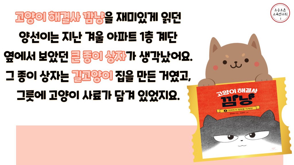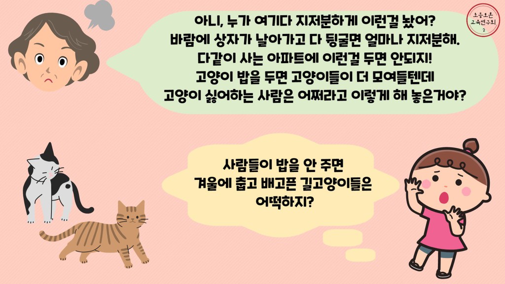 길고양이에게 밥을 주면 안될까요? (글 양선 그림 주희) 작성자한재경|작성시간20.06.23|조회수318 목록 댓글 0 글자크기 작게가 글자크기 크게가 논제 : 길고양이에게 밥을 주면 안된다.글: 장양선 선생님편집: 변주희 선생님 주제토론(길고양이).pdf 첨부파일첨부된 파일이 5개 있습니다. jpg 파일 5_4j4Ud018svc13mmc3t4dxp1x_2cndwm.jpg 다운로드 jpg 파일 6_8j4Ud018svc1flus9s79vqad_2cndwm.jpg 다운로드 jpg 파일 6_aj4Ud018svc1nqs1a9ighrof_2cndwm.jpg 다운로드 jpg 파일 6_dj4Ud018svc1qr6scqoyd5az_2cndwm.jpg 다운로드 pdf 파일 주제토론(길고양이).pdf 다운로드 다음검색 현재 게시글 추가 기능 열기 북마크 신고 센터로 신고 댓글 댓글 0 댓글쓰기 답글쓰기 댓글 리스트