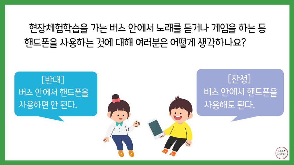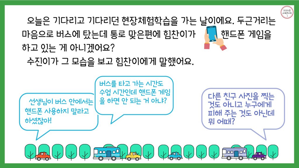체험학습 갈 때 버스안에서 핸드폰 하면 안돼요? (글 수진, 그림 지우) 작성자한재경|작성시간20.06.23|조회수304 목록 댓글 0 글자크기 작게가 글자크기 크게가 논제 : 버스 안에서 핸드폰을 사용해도 된다.글: 이수진 선생님편집: 문지우 선생님 토론자료_수진지우_2 (1).pdf 첨부파일첨부된 파일이 4개 있습니다. jpg 파일 a_j6eUd018svc1rq72bzghof5i_s0bc9t.jpg 다운로드 jpg 파일 c_869Ud018svc1omidmnwdqtb3_s0bc9t.jpg 다운로드 jpg 파일 c_b69Ud018svc1wcmklty8y8u4_s0bc9t.jpg 다운로드 pdf 파일 토론자료_수진지우_2 (1).pdf 다운로드 다음검색 현재 게시글 추가 기능 열기 북마크 신고 센터로 신고 댓글 댓글 0 댓글쓰기 답글쓰기 댓글 리스트